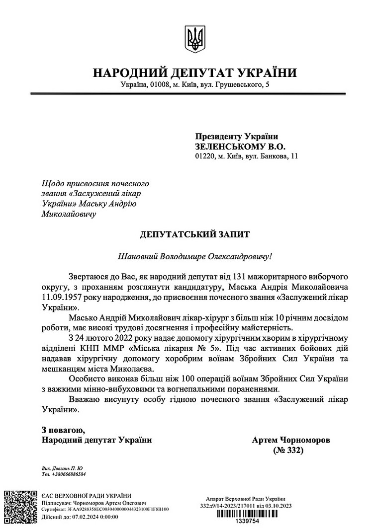 – Звертаюся до Вас, як народний депутат від 131 мажоритарного виборчого округу, з проханням розглянути кандидатуру, Маська Андрія Миколайовича 11.09.1957 року народження, до присвоєння почесного звання «Заслужений лікар України». Масько Андрій Миколайович лікар-хірург з більш ніж 10 річним досвідом роботи, має високі трудові досягнення і професійну майстерність. З 24 лютого 2022 року надає допомогу хірургічним хворим в хірургічному відділені КНП ММР «Міська лікарня No 5». Під час активних бойових дій надавав хірургічну допомогу хоробрим воїнам Збройних Сил України та мешканцям міста Миколаєва. Особисто виконав більш ніж 100 операцій воїнам Збройних Сил України з важкими мінно-вибуховими та вогнепальними пораненнями. Вважаю висунуту особу гідною почесного звання «Заслужений лікар України, - йдеться у зверненні.