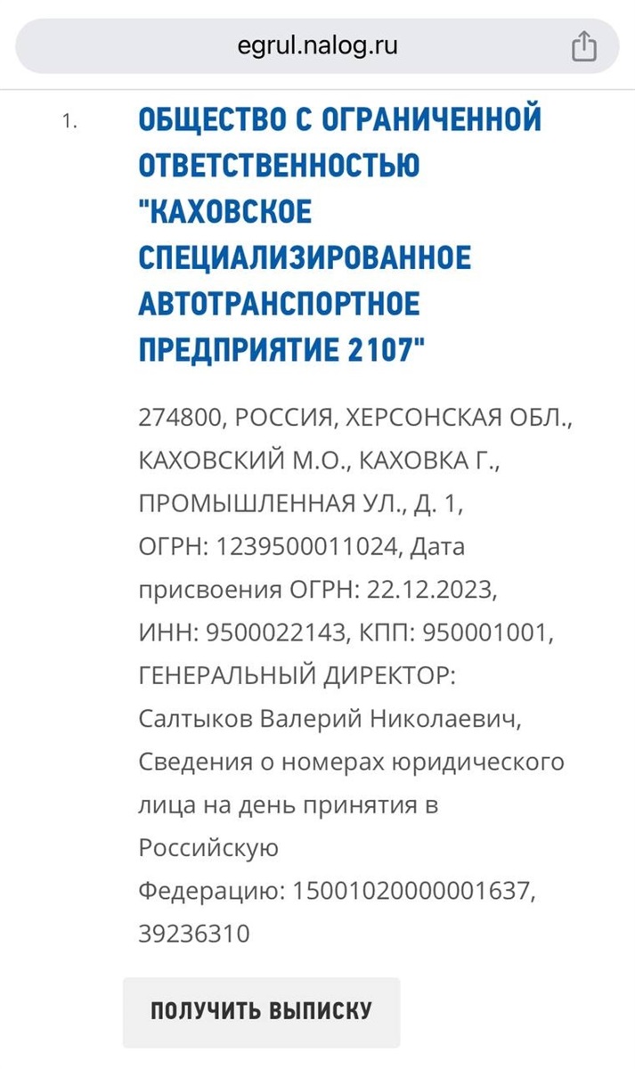 Втім, як свідчать дані з українського державного реєстру юридичних осіб, законним директором ТОВ «Каховське спеціалізоване автотранспортне підприємство-2107» з 2014 року є Денис Салтиков, який володіє ним разом із батьком. Однак, відрізняються основні види діяльності: в Україні це надання послуг вантажним автотранспортом.