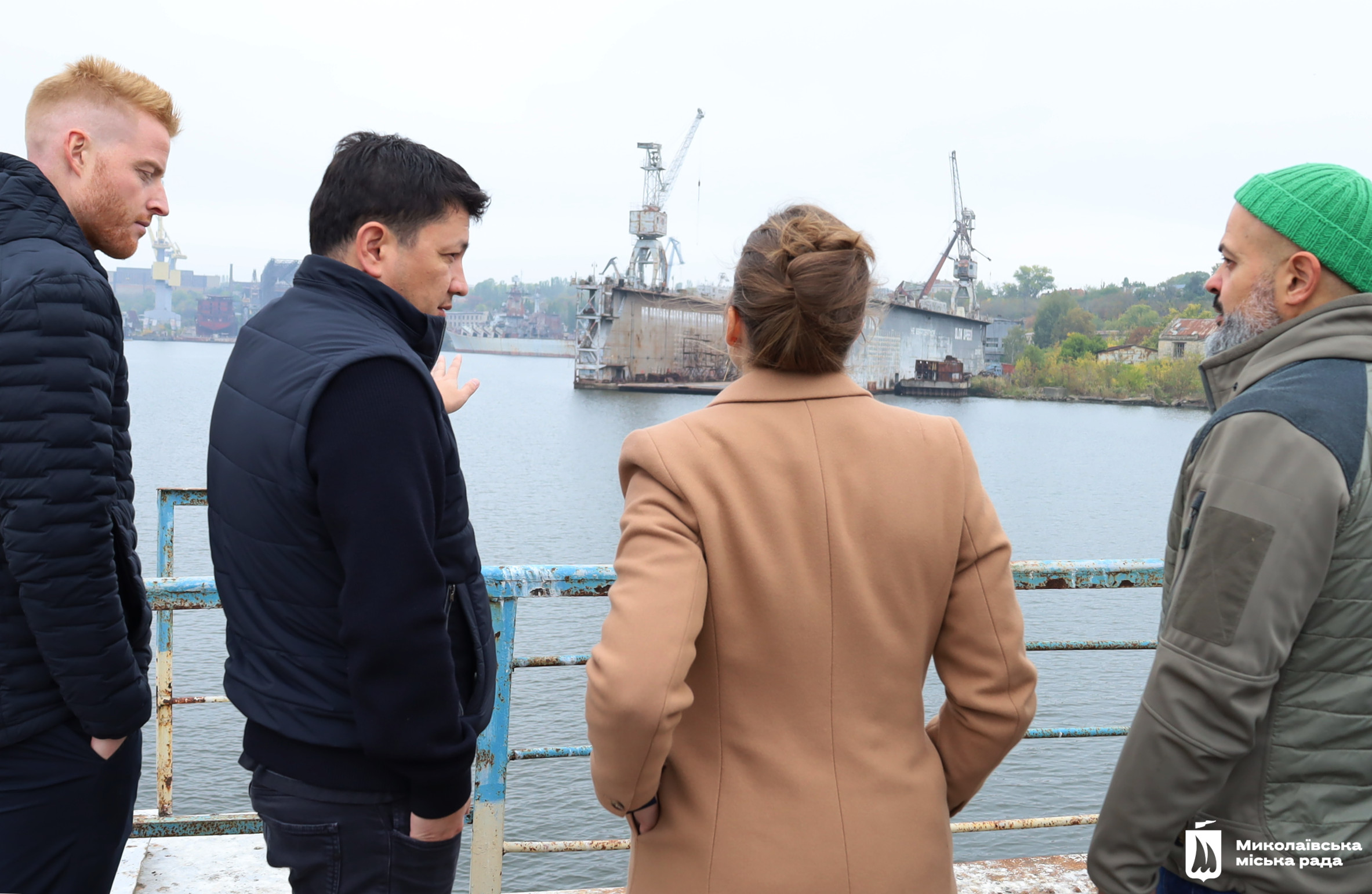 Далі спустилися до Набережної і з пішохідного мосту оглянули суднобудівний завод. Гостям розповіли про колишню славу міста саме у суднобудівній галузі та про перспективи в цьому напрямі.