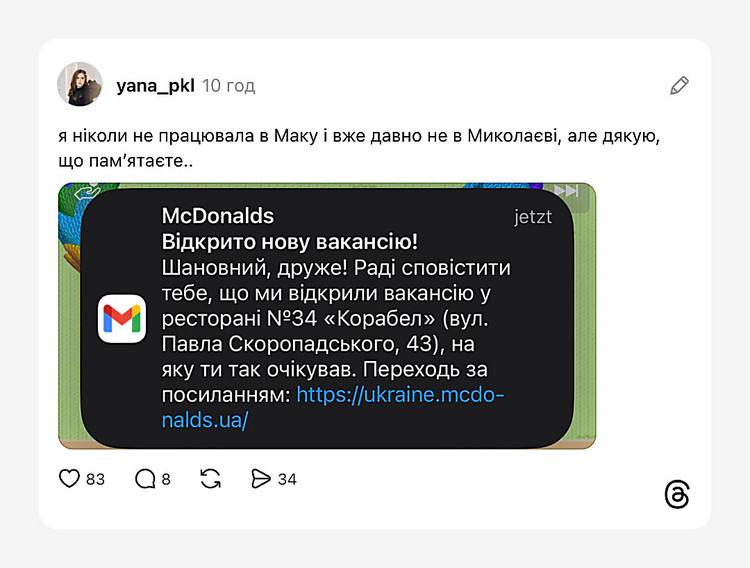 Також відмітимо, що одна із користувачок соцмережі Threads, яка раніше проживала у Миколаєва, повідомила, що їй на пошту прийшов лист від компанії McDonald’s щодо відкриття нової вакансії в Миколаєві.