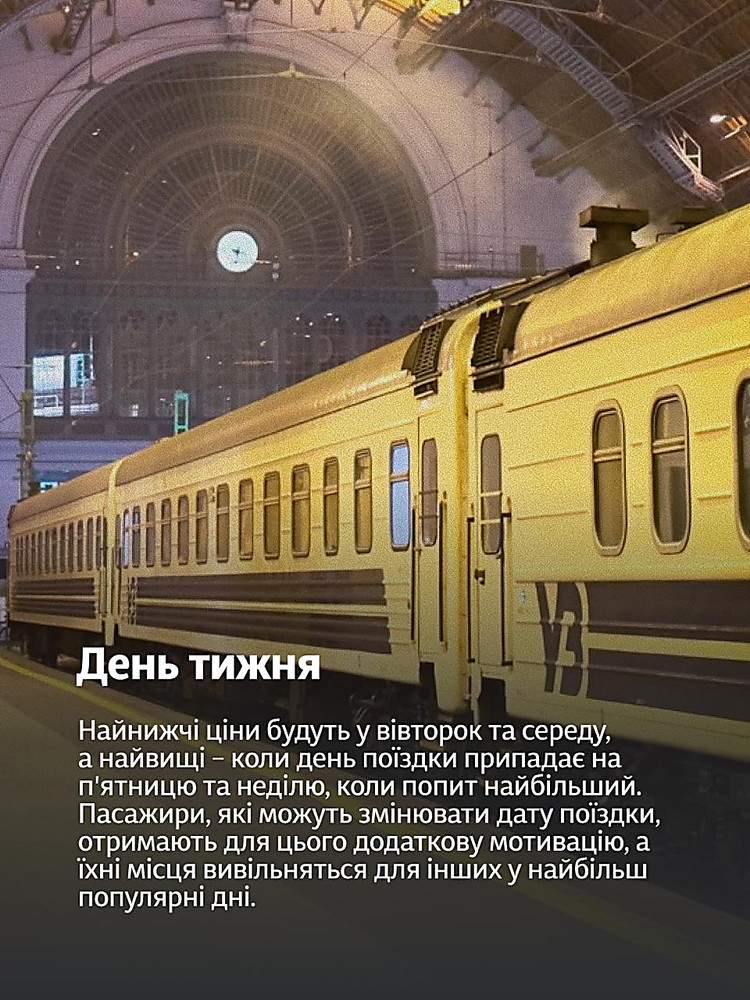 2. День тижня. Найнижчі ціни будуть у вівторок та середу, а найвищі – коли день поїздки припадає на п'ятницю та неділю, коли попит найбільший. Пасажири, які можуть змінювати дату поїздки, отримають для цього додаткову мотивацію, а їхні місця вивільняться для інших у найбільш популярні дні.
