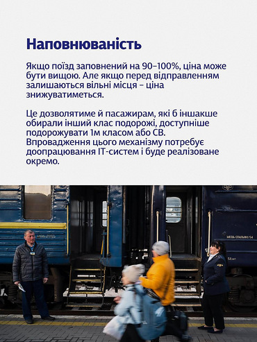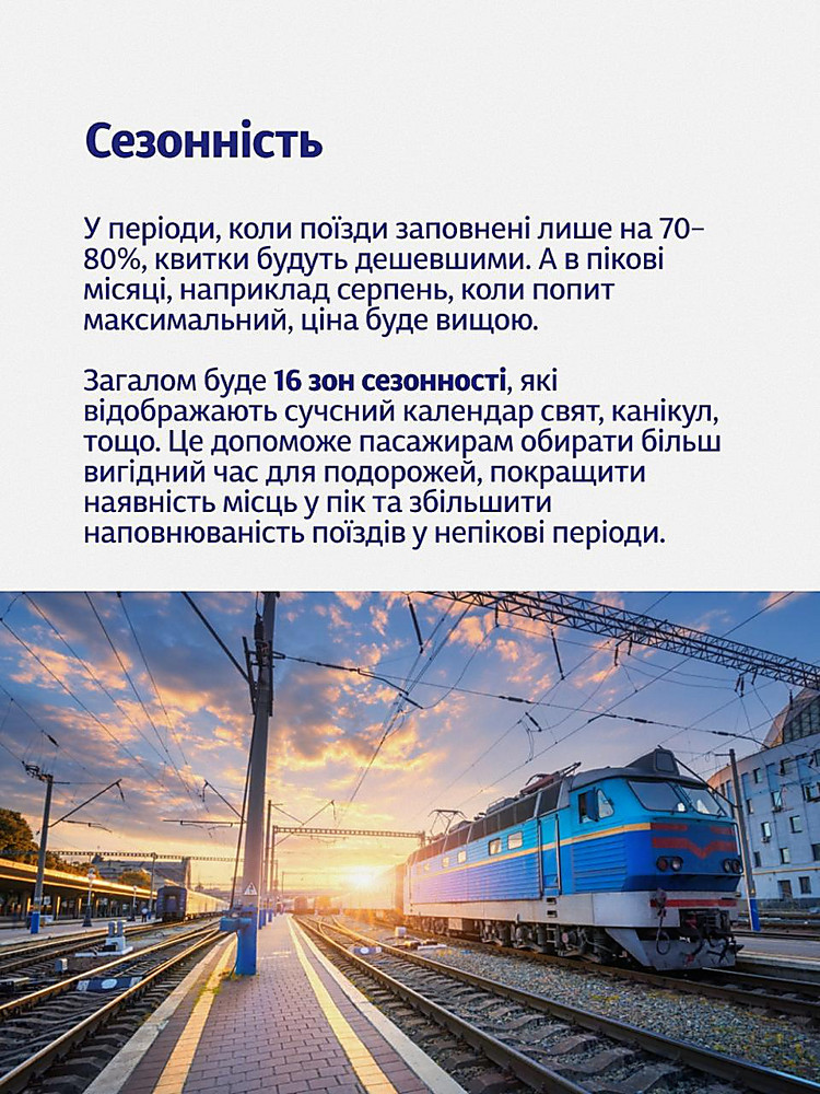 1. Сезонність. У періоди, коли поїзди заповнені лише на 70–80%, квитки будуть дешевшими. А в пікові місяці, наприклад серпень, коли попит максимальний, ціна буде вищою. Загалом буде 16 зон сезонності, які відображають сучсний календар свят, канікул, тощо. Це допоможе пасажирам обирати більш вигідний час для подорожей, покращити наявність місць у пік та збільшити наповнюваність поїздів у непікові періоди.