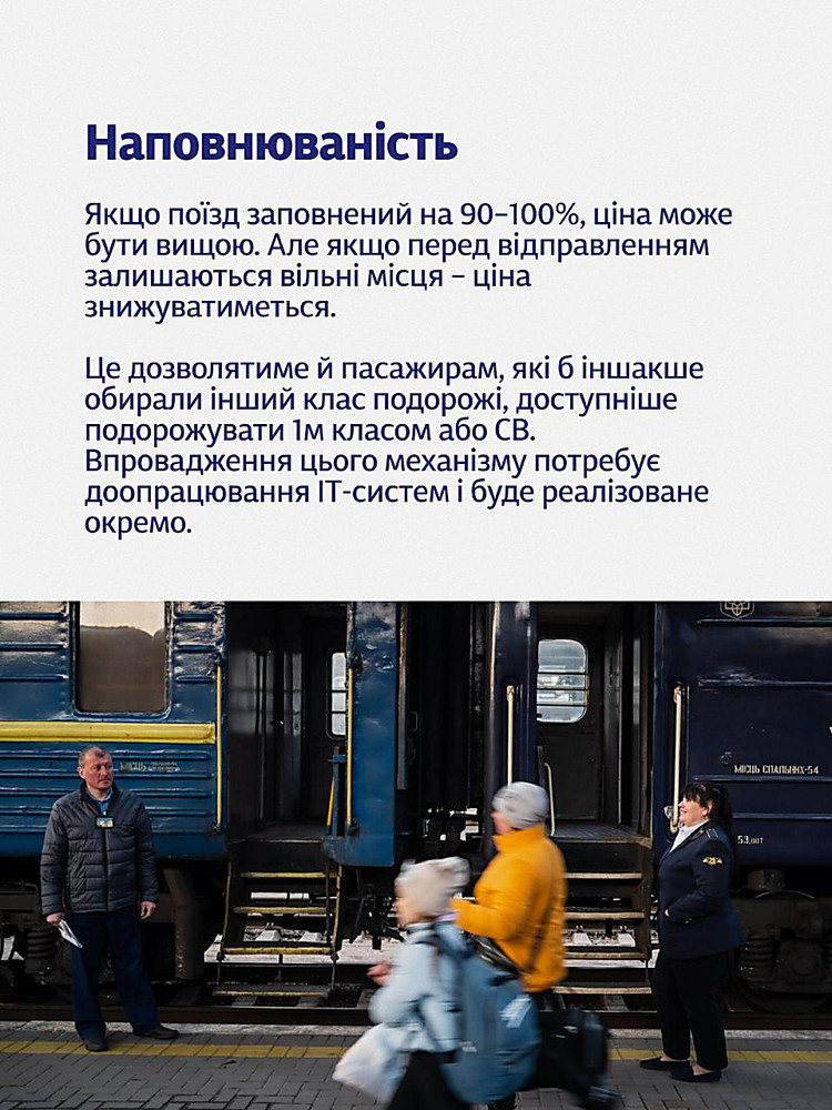 4. Наповнюваність. Якщо поїзд заповнений на 90–100%, ціна може бути вищою. Але якщо перед відправленням залишаються вільні місця – ціна знижуватиметься. Це дозволятиме й пасажирам, які б іншакше обирали інший клас подорожі, доступніше подорожувати 1м класом або СВ. Впровадження цього механізму потребує доопрацювання ІТ-систем і буде реалізоване окремо.
