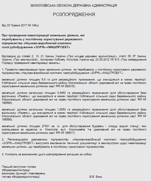 ‒ Провести инвентаризацию таких земельных участков, находящихся в постоянном пользовании государственного предприятия «Научно-производственный комплекс газотурбостроения« Зоря»-«Машпроект »: