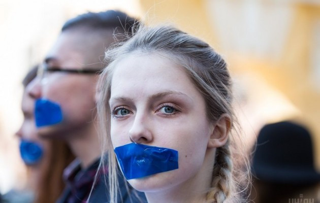 Некоторые из участников акции в знак протеста против запрета общения в российских соцсетях заклеили себе рты скотчем.
