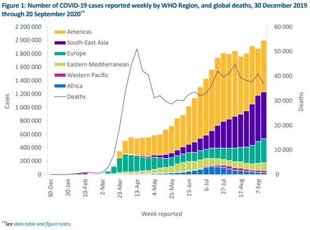 Так, в период с 14 по 20 сентября в мире выявили 1 998 897 заболевших COVID-19, что на 6% больше, чем неделей ранее. Это самое большое количество зарегистрированных случаев заражения за одну неделю с начала пандемии.
