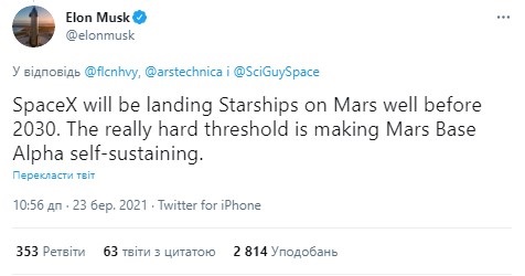 – SpaceX отправит космические корабли на Марс задолго до 2030 года. Самый сложный рубеж – сделать Mars Base Alpha самоподдерживающейся, – отметил бизнесмен.