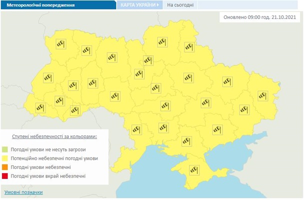 – Днем 21 октября в большинстве областей порывы ветра 15-20 м/с, в Карпатах до 25 м/с, – говорится в предупреждении.