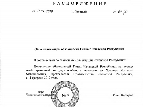 — Исполнение обязанностей главы Чеченской республики на период моей временной нетрудоспособности возлагаю на Хучиева Муслима Магомедовича, председателя правительства Чеченской республики, — говорится в документе.