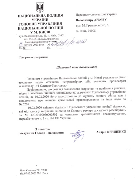 Также сегодня народный депутат Владимир Арьев опубликовал в Facebook ответ полиции Киева о том, что в отношении продюсера открыли уголовное дело.