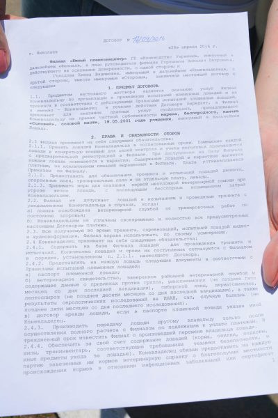 По словам Елены, директор также требует с нее 150 грн за занятия 10 человек, за 20 человек 250 грн, и так далее, хотя данная оплата в договоре не указана. Лошадь принадлежит Елене и весь уход за ней оплачивается по договору. В условиях договора прописаны услуги, которые Елена оплачивает - стойло, питание, а также поле, где она и катает детей. DSC_0041 Внятно объяснить, как производить оплату и куда уйдут деньги кроме как «в кассу», директор не смог.